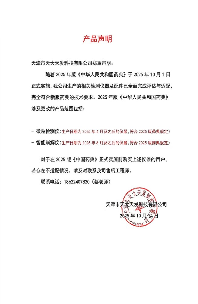 聲 明鑒于2025版《中國(guó)藥典》的更新,為保障天大天發(fā)忠實(shí)用戶的切身利益,凡在2025年之前購置我公司設(shè)備的客戶,若您的設(shè)備未能滿足新版藥典的要求,我們將提供升級(jí)服務(wù)。涉及產(chǎn)品:微粒檢測(cè)儀:GWJ-1···...